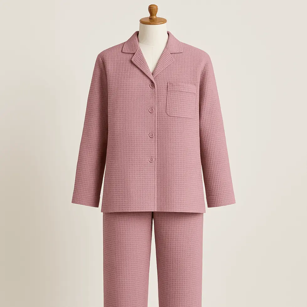El Waffle (gofre) es un tejido con superficie en relieve que imita el patrón de un gofre. Su estructura se forma al entrelazar la urdimbre y la trama creando pequeñas celdas o cubos tridimensionales. Puede tejerse en plano o en punto, y suele elaborarse en algodón, mezclas de algodón-poliéster o lana/acrílico.